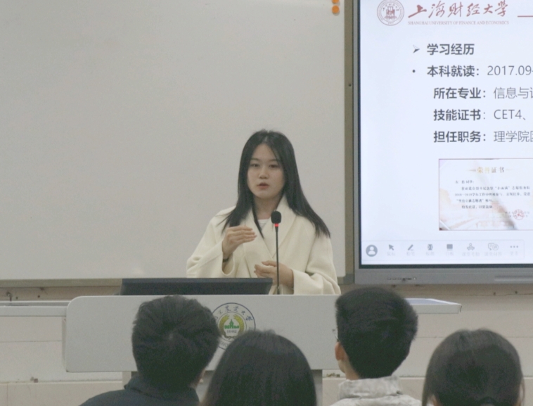 左思学姐侧重于考研、保研方面的分享。她告诉我们,无论是考研、保研还是读博都要注重专业知识,同时也要重视计算机能力的培养,C语言、python、R语言应该要成为我们的必备工具。左思学姐还向我们强调了四六级的重要性,也鼓励我们积极参加数学竞赛和实践活动,提升自我能力。而对科研有兴趣的同学可以在本科期间进行尝试,从而更加清晰自己的人生规划。最后,左思学姐鼓励我们积极报考上海财经大学研究生和博士生,并向我们介绍了其多样的就业方向和广阔的就业前景。