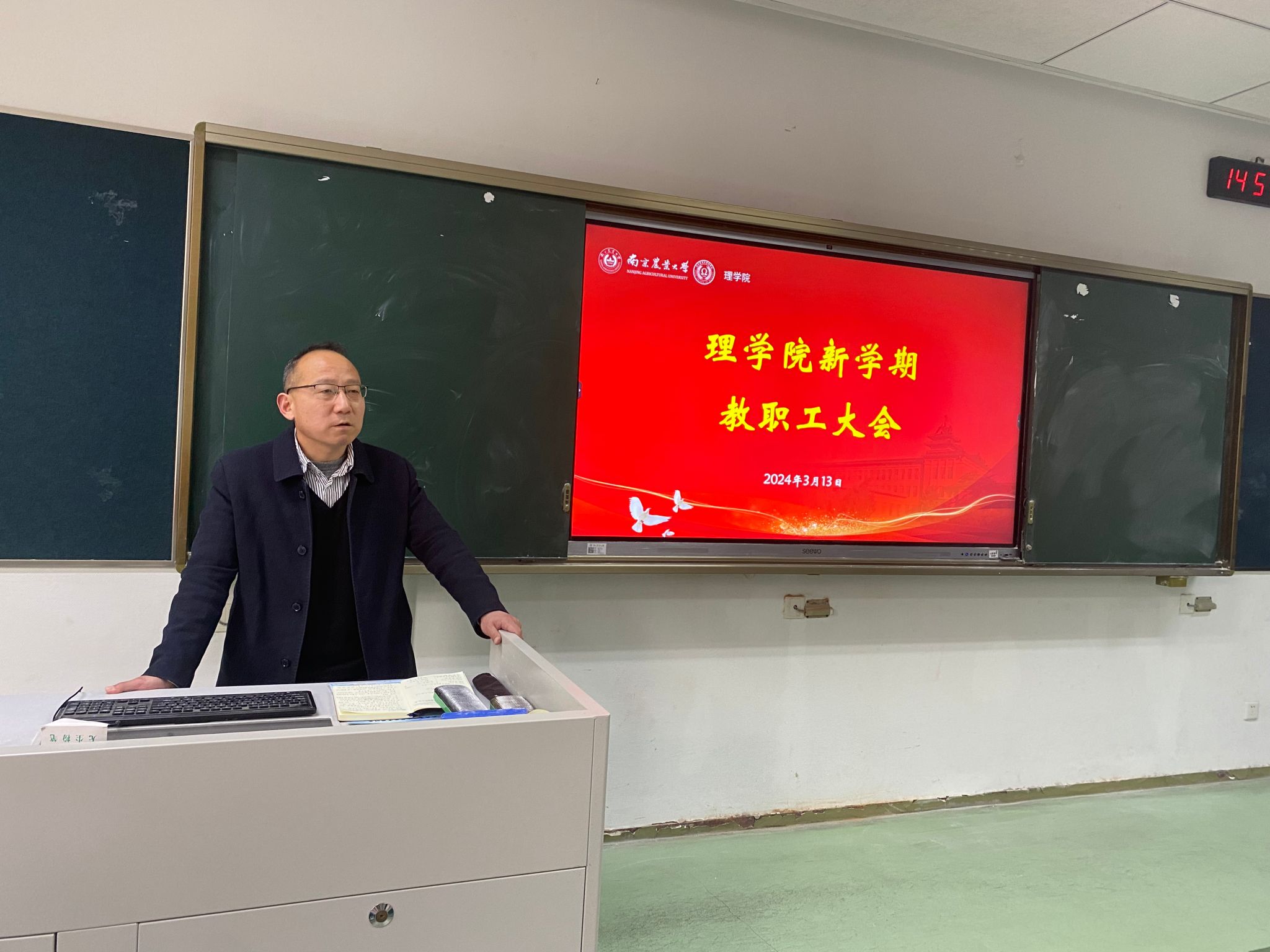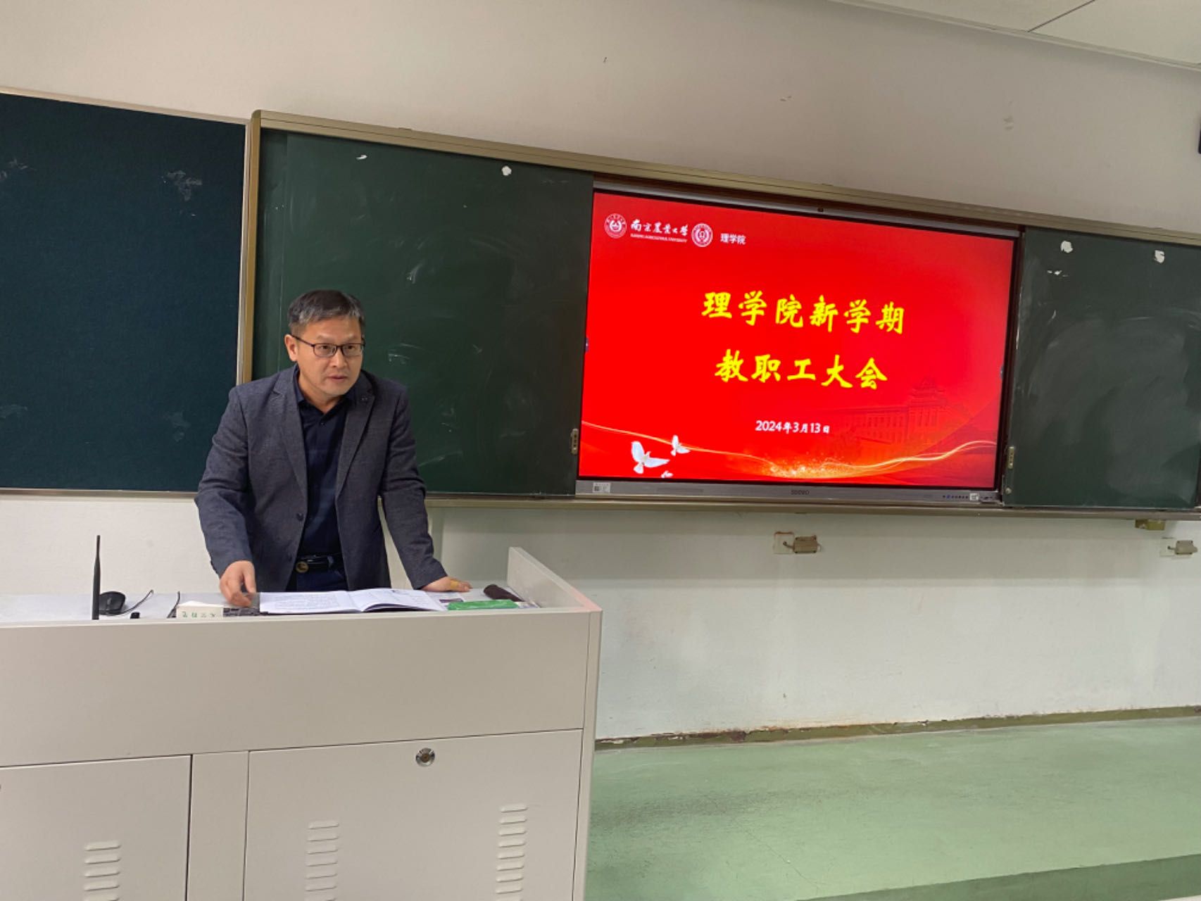 章维华院长传达了校长陈发棣所作《认识再强化 措施再精准 责任再压实 奋力推动学校高质量发展实现新跨越》工作报告精神。全面总结了2023年学院重点工作,并对2024年目标管理考核任务进行解读。他强调,要始终立足高质量发展,抢抓机遇,优化整合有效资源,加强学科专业建设;提高有组织科学研究水平,增强创新服务能力;打造高水平师资队伍,推动一流课程、优秀教材建设,为迎接本科教育教学审核评估再添新活力。全院上下要团结一致干事业,共同参与学院发展建设,提振全院教职工创业的精气神,形成全员作为、主动作为的奋斗风,努力实现2024年学院发展目标任务。